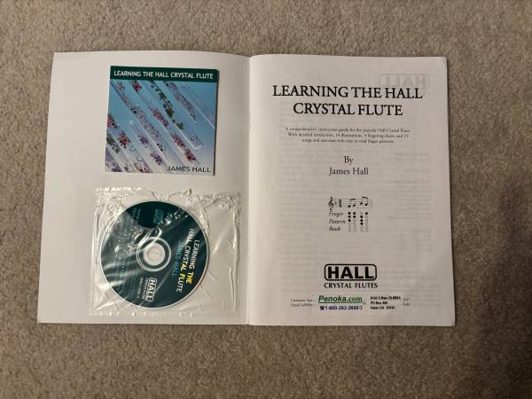 Included with the flute is the original “Learning the Hall Crystal Flute” instruction book by James Hall, along with the companion CD (never played). The book features clear illustrations, fingering charts, and beginner-friendly songs — a great resource for anyone new to the crystal flute.