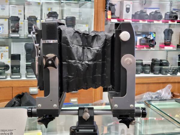 Bellows have been pressed in and have light pinholes at corners and edges, but could be easily patched or replaced. Rest of camera in really nice shape, and all adjustments are smooth.