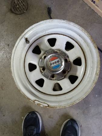 Jeep steel wheel with center cap. about 40 years old, Good condition some pitting on chrome center cap . 15 inch from old cherokee or wagoneer. worth $40 if you need one good luck finding one call...