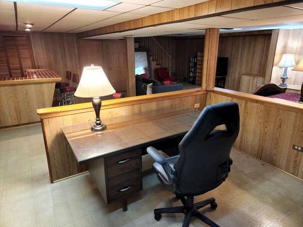 Spacious Fully Furnished Basement (with heat and air conditioning) comes with Queen Bed, large executive desk with drawers, rolling office chair, refrigerator, microwave, shelves, wet bar with sink, coffee maker, toaster. Full sized couch. Standing mirror.
