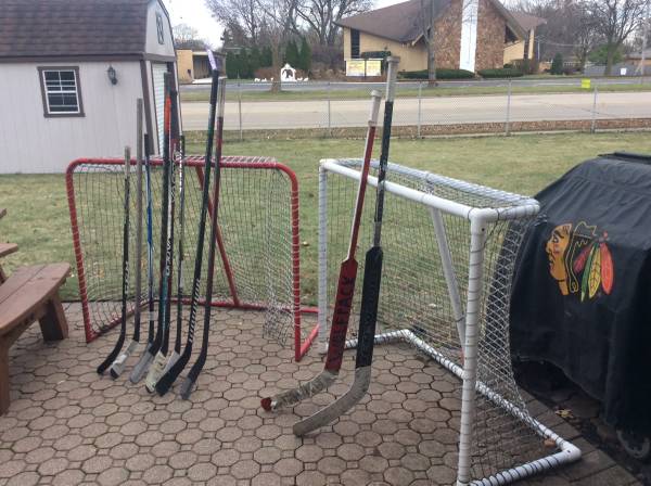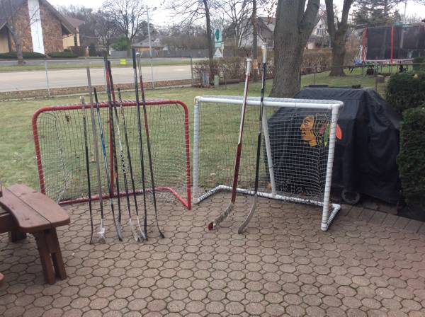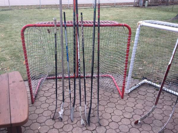 10 hockey sticks and 2 goalie nets, nets need to be restrung