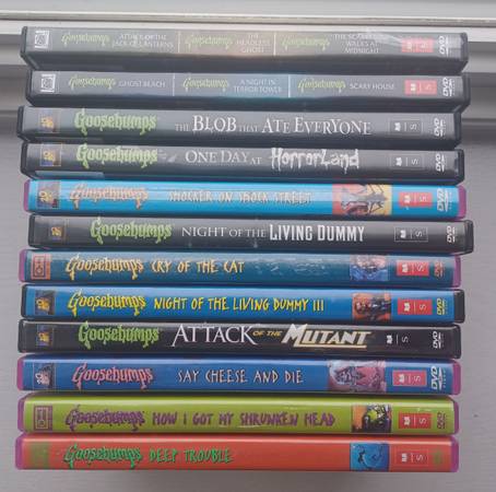 There are 12 movies in this lot including: The Headless Ghost, One Day At HorrorLand, Shocker On Shock Street, A Night In Terror Tower, Night of The Living Dummy, How I Got My Shrunken Head, The blob that ate everyone, Cry of the cat, Night of the living dummy three, Attack of the mutant, Say cheese and die, And deep trouble!