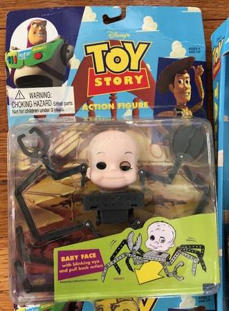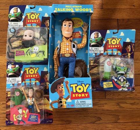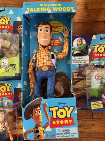 Toy Story toy Lot Buzz Lightyear Baby Face Woody. Toy Story lot consists of: 1.) Toy Story Pull string Talking Woody (Doesn't work), 2.) Toy Story - Baby Face Action Figure, 3.) Toy Story - Boxer Buzz Light Year, 4.) Toy Story - Fighter Woody Action Figure. All are still sealed. Package shows some wear. Available for LOCAL PICKUP ONLY in Palatine. $200 .........cash