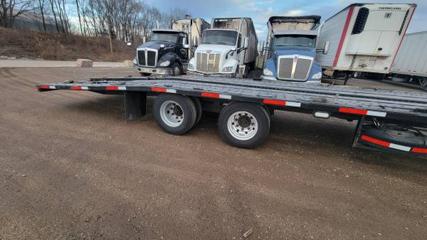 Shipshe stepped trailer with two 15k axles, 8 tires dually, 2 spare tires, aluminum rims outside, heavy duty 20000 pounds steel rims inside, 4 tool boxes, 9000 pounds winch with wireless remote and wire remote, ramps in the back 10 feet, in the top 4 feet, hydraulic drum brakes, enclosed in the middle, with rail package for RV. Comes with 12 straps and hitches and 2 extra new rims. Ready to work for RV loads
