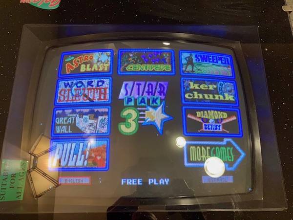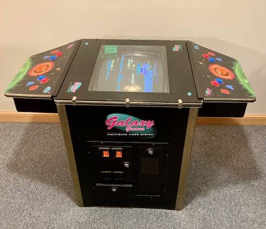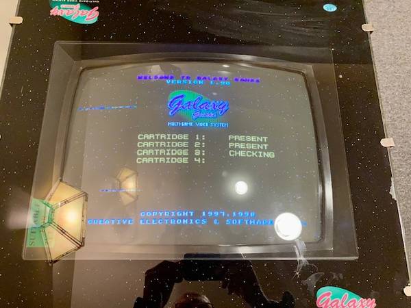 Rarely, if ever available Galaxy gaming system manufactured by Creative Electronics' and Software Systems. This is a two-player console with three gaming cartridges. There are some operational issues with the system, but likely something that can be fixed by a knowledgeable tech. See photos for details.