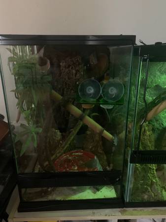 Male & female crested gecko. The orange/red one is a male, he's very social & the spotted one is a female, she's a little more shy but never skips meals.