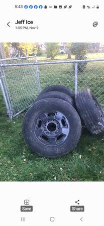 GM 8 Lug aluminum wheels (2013 ish) Tires thin, but all hold air one season left .wheel adapters and Lugs included. Adapters are for 1998 or older, they were on a 94. Center Caps also $200 OBO. text...