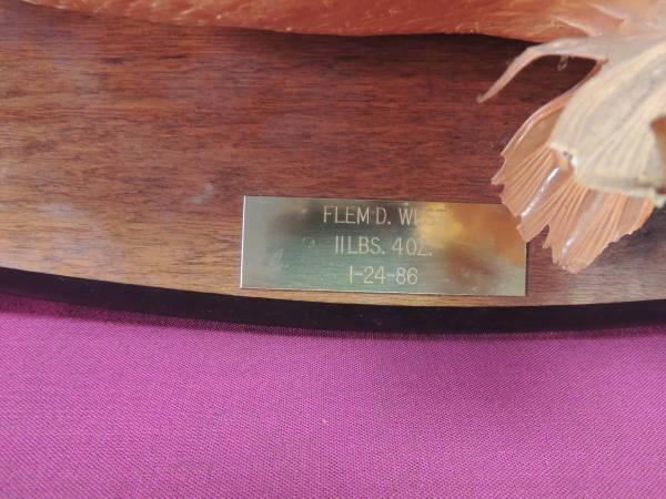 One mounted large mouth bass for sale. Mounting and bass are in excellent condition, mounting has no chips or cracks. The bass has a plaque that states: Flem D. West, 11 lbs 4 oz, 1-24-1986 It...