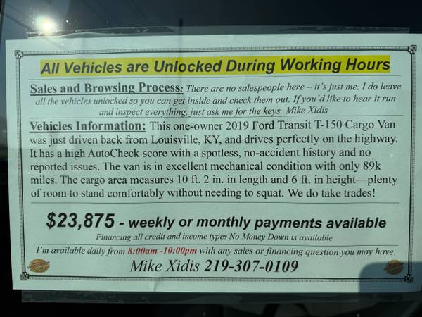 I can be reached daily 8:00am -10:00pm with any sales or financing questions. Call or text Mike Xidis 219-307-0109
