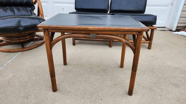 3 piece rattan and leather set. 1960s by Vogue Rattan Manufactoring Co, Lexington Kentucky. Very nice condition!! Heavy duty leather. Chair rocks and swivels. Leather cushion attaches with straps that have snaps. 2 seater small couch. One seat cushion will need the zipper repaired or replaced as the zipper material has ripped from age. Shown in last photo. Measurements are in photos and below. This is a beautiful, well-built set! The original tag is still attached to one seat cushion. The rest have been removed over time. The couch also has a thin, almost sheet like material across it covering the springs. I believe this was just meant to help keep the cushion from sliding. I removed this as the material was torn and fraying. This is for LOCAL pickup only.