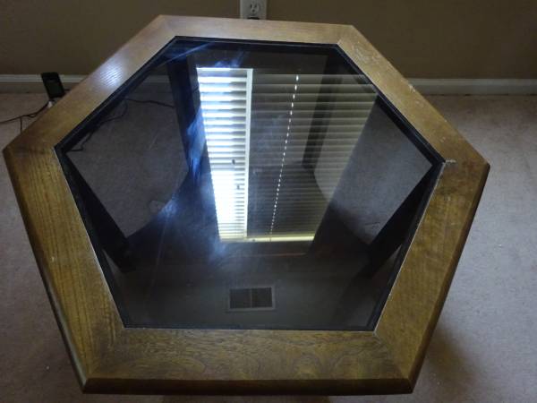 Vintage hexagon coffee table Smoked glass top Approx 19.5" high, 27" across a few nicks as shown