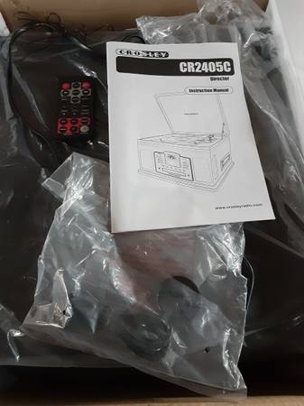 Comes with remote, 45 rpm spindle disk, aux cord, and original user manual.