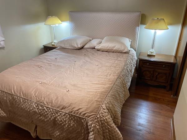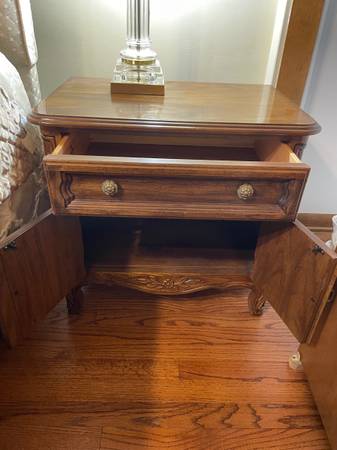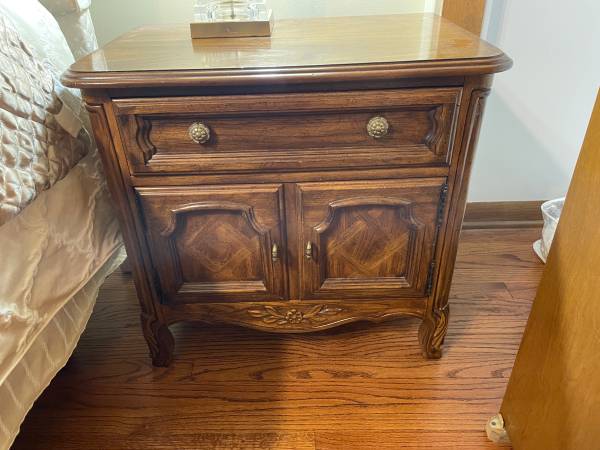 Drexel 8-piece bedroom set. 2 nightstands, 2 upright dressers 1 solid marble make up table with drawer. 1 queen size bed, including mattress, box springs frame and headboard. 2 lamps for night stands.