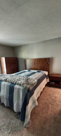 For sale, elegant wood 3 piece bedroom sunburst set bed (Queen), armoire and night stand. Only 2 yrs old no issues and solid, bed currently has 15 in pillow top mattress. Nightstand has USB ports. A steal at $1800.00. You must take apart and haul from 2nd story Apt. Armoire is heavy.