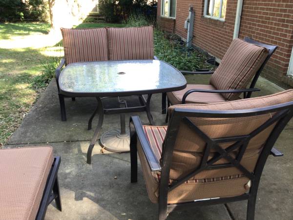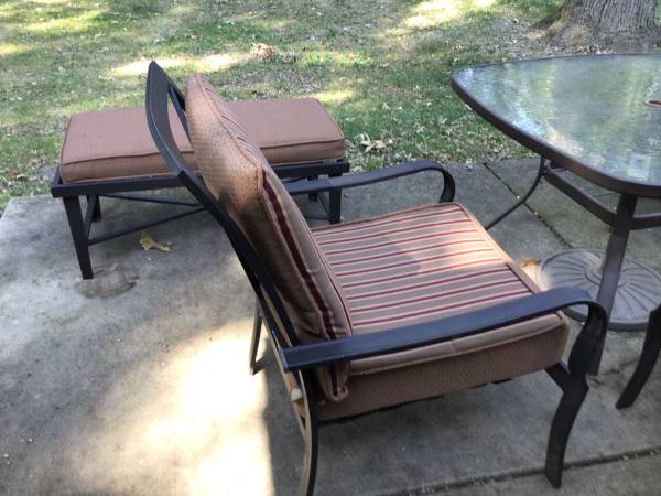 Offered is a six piece sturdy metal patio set with 4 inch cushions.
