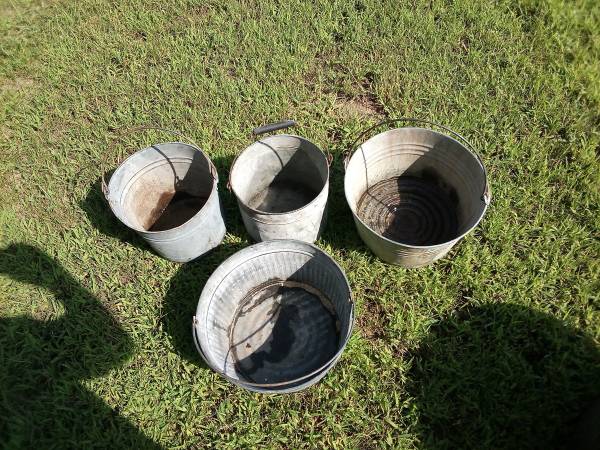 Vintage Metal Buckets four of them. Good old rustic shape to plant flowers in or decor around your garden. Any questions just ask. If this ad is still up I still have them, don't even ask.