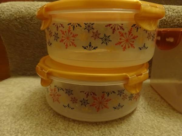 All new bread container - $7 cereal container - $7 2 round holiday containers - $8 Will separate