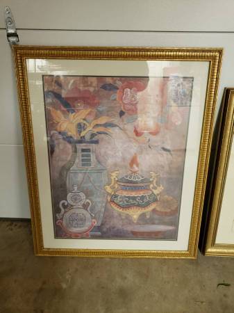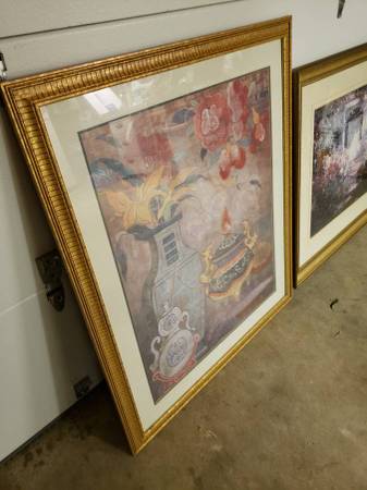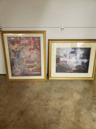 TWO LARGE FRAMED PICTURES WALL DECORATIONS PICTURES. FRONT DOOR PICTURE MEASURES 40 3/4" WIDE BY 34.5" TALL. OTHER MEASURES 34 1/4" WIDE BY 41" TALL. GREAT DECOR FOR THE WALLS. PRICE IS FOR BOTH. AS IS. PLEASE FEEL FREE TO CALL ME AT TWO ONE NINE SEVEN THREE ZERO SEVEN FIVE EIGHT EIGHT.