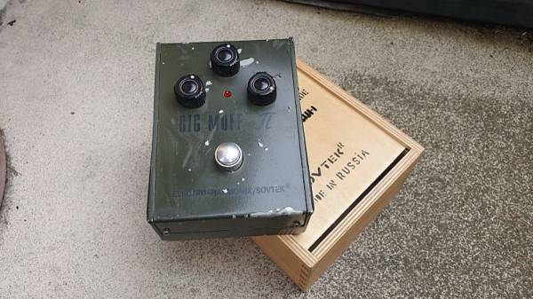 Electro-Harmonix Big Muff Pi distortion / fuzzpedal from 1994. Well preserved, tall font, first version of the green Sovtek made Big Muffs . Comes with original wood box.