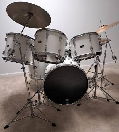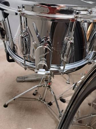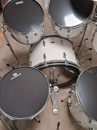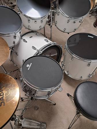Vintage (1978) Slingerland 6-piece drum set. Simply fantastic condition! Completely disassembled, cleaned, and polished. All new Evans black Hydraulic batter heads with brand new Evans EC Reso resonant heads. 24" Bass drum with new Evans EMAD 2 batter head and new Code Enigma resonant head. Kit includes two Slingerland counter weight boom cymbal stands with a 20" Zildjian ride and a 16" Paiste Power Crash, two Slingerland dual tom mount stands, Pearl hi hat with Sabian cymbals, and kick pedal. Each shell (except snare) has the reinforcement wood rings on the inside, both top and bottom. Snare is a matching Slingerland 14" chrome jewel.