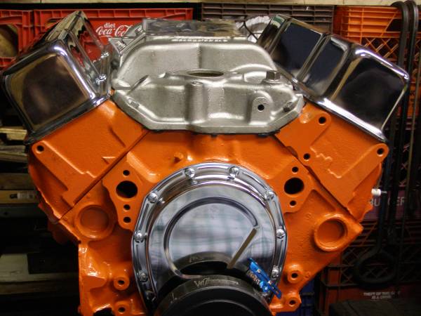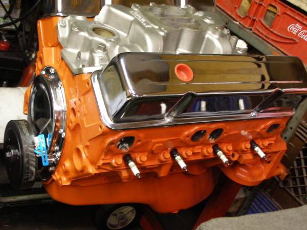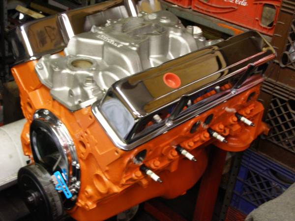 SBC--355(350+.030)--4 BOLT MAIN--#3970010 BLOCK--2.02/1.60 HEADS WITH SCREW IN STUDS AND GUIDE PLATES--10 TO 1 COMPRESSION--MOLY RINGS--"CLOYES" DOUBLE ROLLER TIMING CHAIN AND GEARS--"CLEVITE" MAIN, ROD, AND CAM BEARINGS--FRESH HOT TANK, FREEZE PLUGS, OIL GALLEY PLUGS AND CAM BEARINGS--"FEL PRO GASKETS--"MELLING" OIL PUMP, PICKUP, AND DRIVE ROD--CHROME VALVE COVERS--"FLUID DAMPNER" HARMONIC DAMPNER($500)--CHROME TIMING CHAIN COVER--SPARK PLUGS--"COMP CAMS" CAM, LIFTERS, SPRINGS, RETAINERS, KEEPERS, PUSHRODS, AND ROCKER ARMS--ADJUSTABLE TIMING POINTER--"EDELBROCK"ALUMINUM INTAKE MANIFOLD--TOO MUCH TO LIST--"400" STREETABLE AND RELIABLE HORSEPOWER ON PUMP GAS--