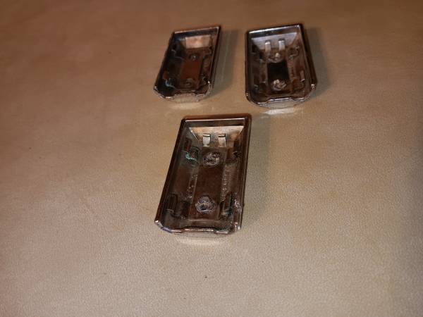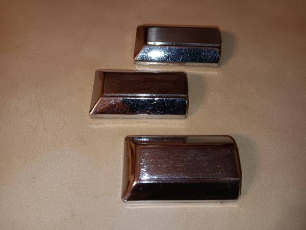 Used door panel 3 piece door pull metal end caps that snap onto clip that holds the ends of the pull straps firmly in place on the front door panel. Original chrome plated with brushed finish on the face part #7799435 measuring 2"L x 1 1/4"W. Calls only will not respond to texts or emails.
