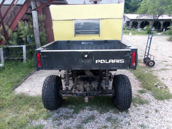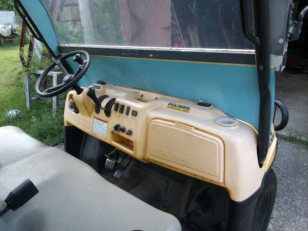 Polaris UTV 6x6, I think it is called a Ranger. He built a roof and put a windshield on it and a back window, dont ask me why, I have no idea. I think he said it was 500cc also. My dad took two tires off of it cause he said it was messing up the grass. My dad loved this thing for many years, then he bought a Gator and he parked it. When I got it, it was not getting gas and I fixed that. I made sure the radiator fan kicked on and all fluids are ok, and drove it around a little. Now I think it needs a new starter, it just clicks and if you tap on the starter it moves but sounds like it isn't engaging. I have to many other projects already and I need room, so it needs to go. MAKE ME AN OFFER, be reasonable though. All the lights work and AWD works as well. I even found a book that I will throw in. I have no title and as of right now cant find the other two wheels and tires. So it is being sold as is with a bill of sale. Any questions just ask. If this ad is still up I still have it, don't even ask.