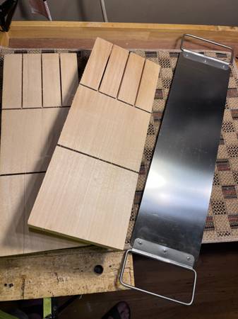 This is a pair of well-seasoned European willow cello block sets plus a new metal cello rib bending strap. The blocks are over 8 years seasoned and ready to use. The bending strap is new and unused. Price for all three is $95 plus shipping, a substantial savings over online purchase.