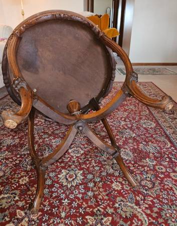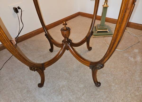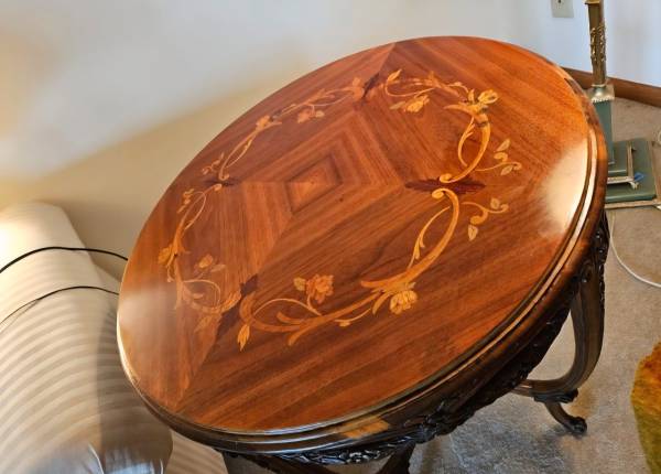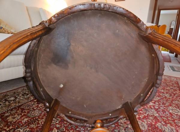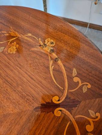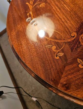 Pre-owned. ANTIQUE 1920s FRENCH LOUIS XV ROUND TABLE with satinwood floral inlay top, carved wood on edges/legs and central finial. Beveled glass top. Imperfectionon top, see last 2 pictures. 25"H x...