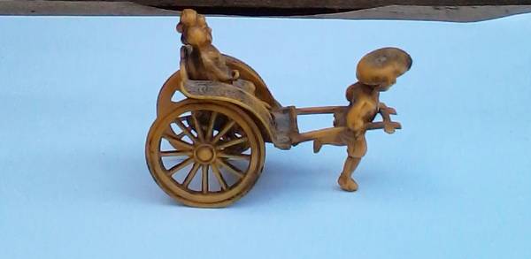 vintage antique Asian figurine tiny man pulling rickshaw cart with Geisha woman women