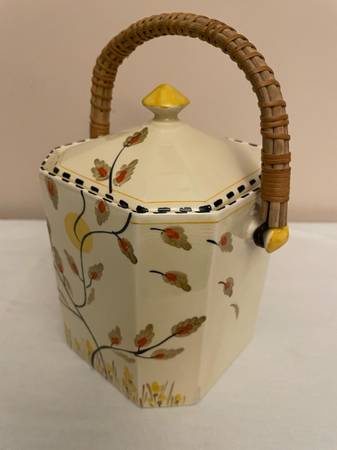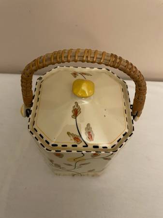 Vintage English biscuit/cookie jar with bamboo handle Hand painted and numbered 5 inches x 5 inches; 9 inches tall including handle In very good condition $15.00 (cash only, pick up only, please)