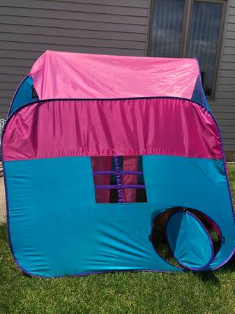 Blue, red and purple Kids PlayHut House, has a windows door and secret opening. Folds up for easy storage.