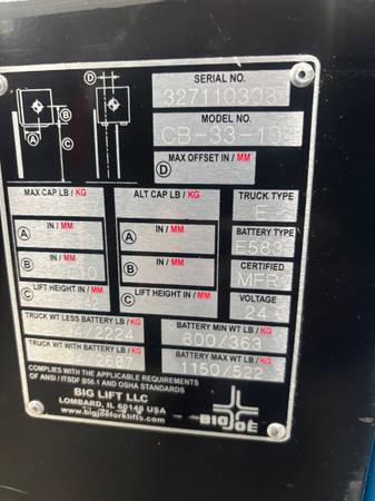 2016 Big Joe model CB-33-104 3,300 Lbs Capacity 104" Two Stage Mast Counterbalance Stacker 24V Battery Included 2,280 Hours $5,900.00 Plus Tax We can source a charger if needed - figure $500-900...