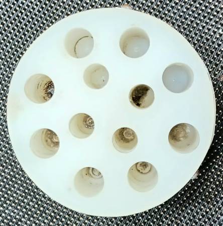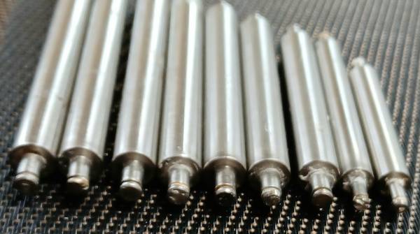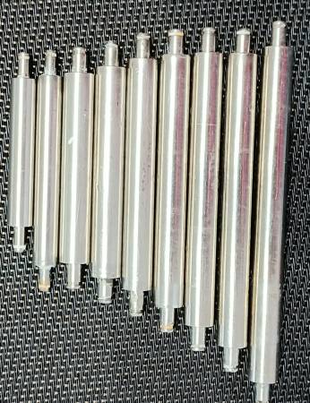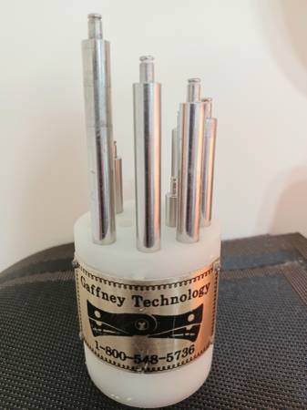 Good condition vintage Gaffney technology 9 prosthetic alignment tools with holder. 4 5/8 inch, 4 and 1/8 in, 3 and 7/8 inch, 3 5/8 inch, 3 3/8 inch, 3 and 1/8 inch, 2 and 7/8 inch, 2 and 7/8 in different diameter, 2 and 3/8 in. 9 rods with two ends each.