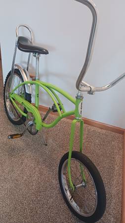 Up for sale is a used schwinn stingray chopper style 20"banana seat bicycle. This bike was restored and has never been riden since restored rear tire is 20" and the front tire is 16"..also the rear fender was painted the chrome paint color. Schwinn serial number is FR508437 made in May 1980. SEE PICTURES. Cool old bike