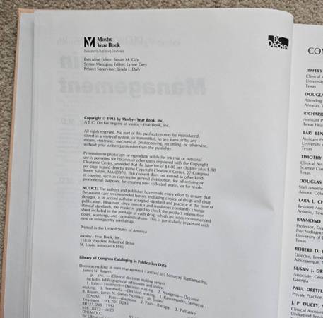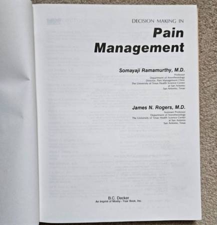 Used, in very good condition. Super clean, no torn/stained/highlighted pages. "DECISION MAKING IN PAIN MANAGEMENT" by SOMAYAJI RAMAMURTHY AND JAMES N. ROGERS, 1993. Published by Mosby - Year Book,...