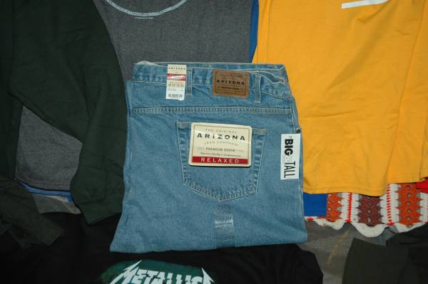 12 Cubs tee shirts, 1 Cubs long sleeve tee, 8 Black Hawk tee shirts, 2 Coal City tee shirts, 2 Coal City sweat shirts,1 Metallica and 1 U of I tee shirts That's 27 New with tags, some with hangers, all are Men's 2X. Also Arizona jeans men's 52x30 new
