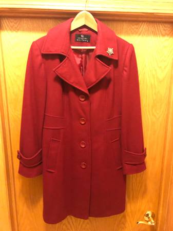 Women’s dressy, dark red, wool blend, knee length coat Has satiny polyester lining 2 Side pockets Size 12 Like new $10.00 (cash only, pick up only, please)