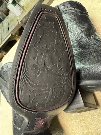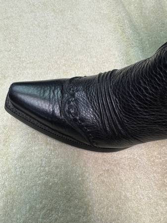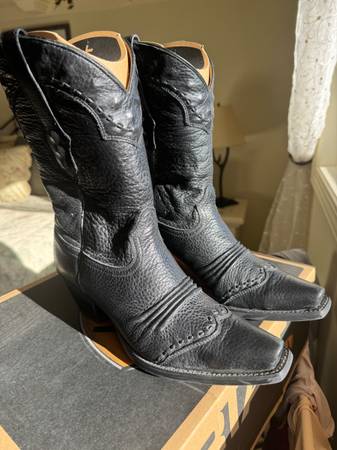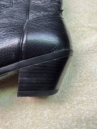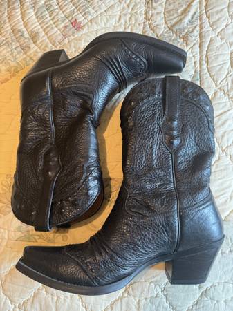 ARIAT Women's Cowgirl Boots size 9B (medium) in Black Deertan Soft fine leather. With a distressed craftsmanship for a uniquely worn look. Height 11' with a 2" Dress Heel and the X-Toe. It has Duratread Sole which you can see has absolutely no wear. Boots have ATS Technology which provides ergonomic support on uneven terrain. Gorgeous Stitching and attention to detail makes these boots wearable with Shorts, Jeans or a Dress. These finely crafted boots were worn only twice to westernwear parties. Close up details show them to look almost Brand New. $200.00 when originally purchased. They can be shipped for an additional $20.00. Thanks for looking