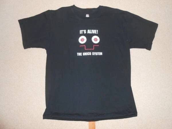 Able Distributors "It's Alive The Unico System" shirt, size large, black, in excellent condition. Shirt is 100% cotton and measures 27.75" from top to bottom and 21" across the underarms. Graphics...