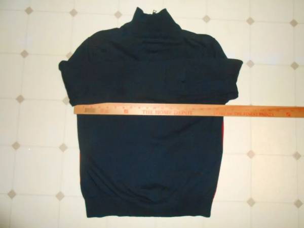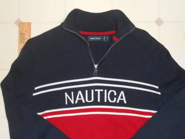 Men's Nautica spell out 1/4 zip sweater, navy blue/red with white striping and lettering, size medium, in excellent condition with no rips, tears or stains. The sweater is 100% cotton and measures 25" from top to bottom and 19" across the armpits. Smoke free, pet free home.
