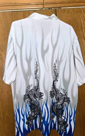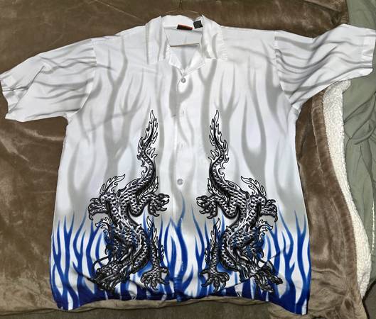 This vintage Y2K ODO button-up shirt is a must-have for any fashion-forward man. Featuring a stunning graphic print of blue flames and dragons, this shirt is perfect for any occasion, whether it's a casual day out or a party/cocktail event. The short-sleeved shirt is made of polyester material and has a regular fit, making it comfortable to wear all year round.