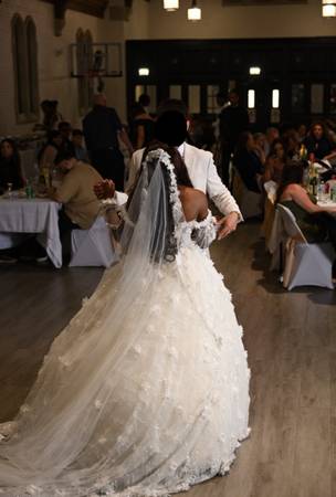 Beautiful Princess Ball Gown Wedding dress custom made! It has a corset back and buttons and is off the shoulder and back of right sleeve has small rip easily fixable and is so beautiful and sparkly with 3D flowers! Let me know if interested $2300 or best offer!