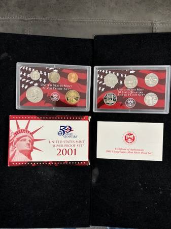 For Sale is a gorgeous 2001-S U.S. Silver Proof Set in the original government packaging. The Silver Proof sets were released from the mint 1992 til today specifically for collectors of high quality silver proof coins. They only minted just over 889,697 of them. There are 10 total coins in the set. The Sacagawea Dollar, Nickel, Cent are regular issue proof coins, but the Half Dollar, Dime, and Five State Quarters are all 90% silver, for a total of 7 silver coins. The State Quarters in this set are the New York, Vermont, North Carolina, Kentucky, & Rhode Island. The set comes in the original government packaging including the certificate of authenticity.