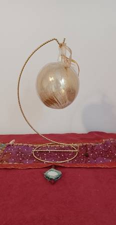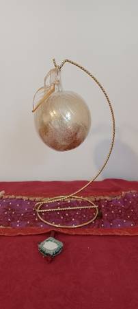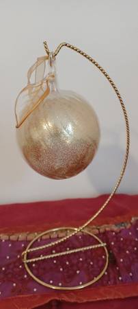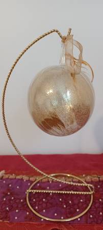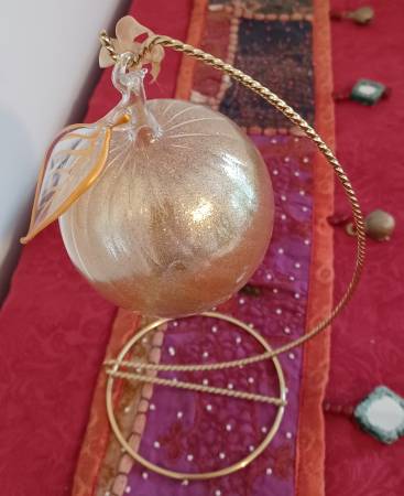 Beautiful hand blown glass ornament, apple shaped, with attacked glass leaf on a gold tone metal stand. The glass ornament is 5 in high by 3 1/4 inches diameter and the leaf is 2 and 1/2 in Long. The gold tone stand is 9 and 1/2 in high with a 4 inch base. No cracks or breaks.