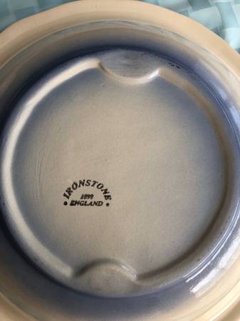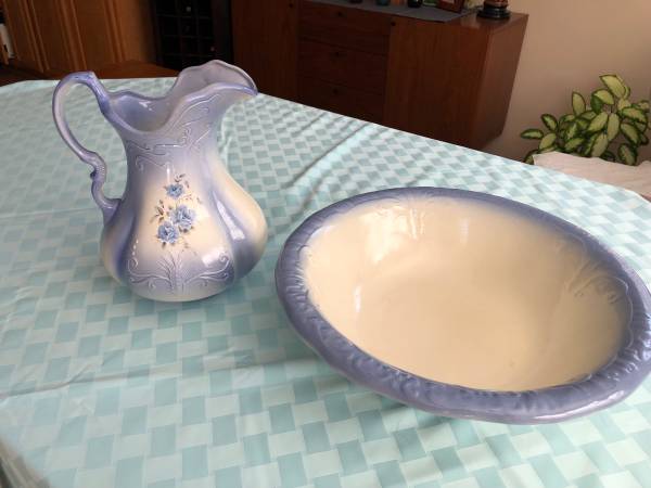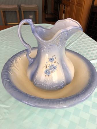 Vintage Pitcher and Wash Basin Set in blue and white Stamped “Ironstone 1893 England” In excellent condition; no chips or cracks Pitcher is 12” high Basin is 16” diameter, 5” high $20.00 (Cash only,...