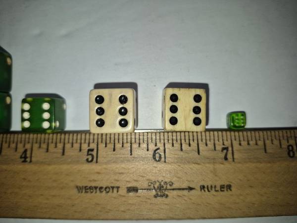 Lot Of 11 Vintage Dice in good condition. The 9/16" green die on top appears to have "pen" marking in the pips. Smoke free, pet free home.