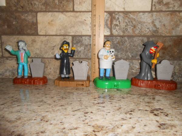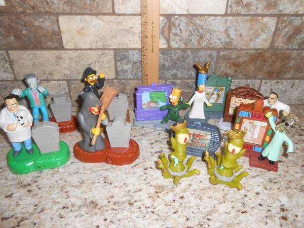 Lot of vintage Simpsons Treehouse of Horrors, Burger King figurines, 2001 and 2002, in very good condition. The 2001 series is called Spooky Light-Ups. There are 4 complete sets, only the light on the Dr. Hibbert works, the lights on the other 3 do not work. The 2002 series is called Creepy Classics. There are 4 complete sets and 1 set that does not have a base. Most pieces are excellent, some show a little wear. Smoke free, pet free home.