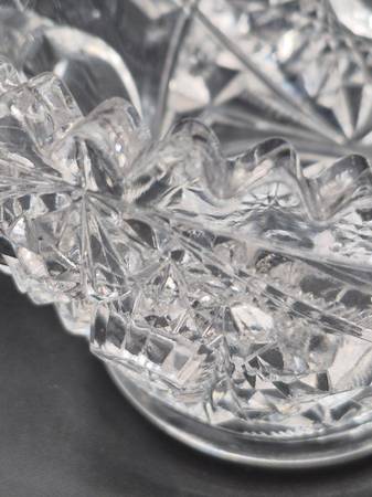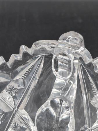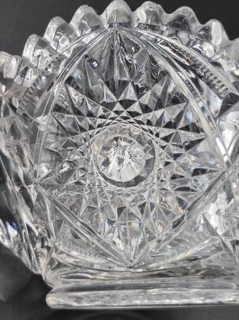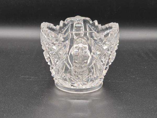 Vintage American Brilliant Period Cut Glass Sugar Bowl, 3.5", in fair condition. This 2 handled open sugar bowl is 3.5" tall and has a 4" opening, 6.75" with the handle length. There are 2 spots in the serrated rim that have a chip, see pics. Both of the hobstar designs on either side have some wear on the facets, please see pics. Smoke free, pet free home.