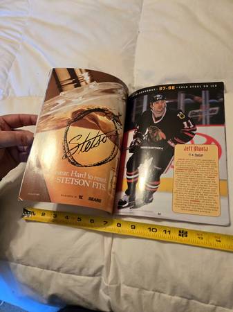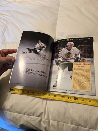 The yearbook features photographs and information about the team and its players from that season, including Chris Chelios, Tony Amonte, and Jeff Hackett. The 1997–98 season was the 72nd season for the Blackhawks in the NHL, and they did not qualify for the Stanley Cup Playoffs, which ended a 28-year playoff streak. Some of the players on the team that year included Tony Amonte, Chris Chelios, and Brent Sutter, who retired after that season.